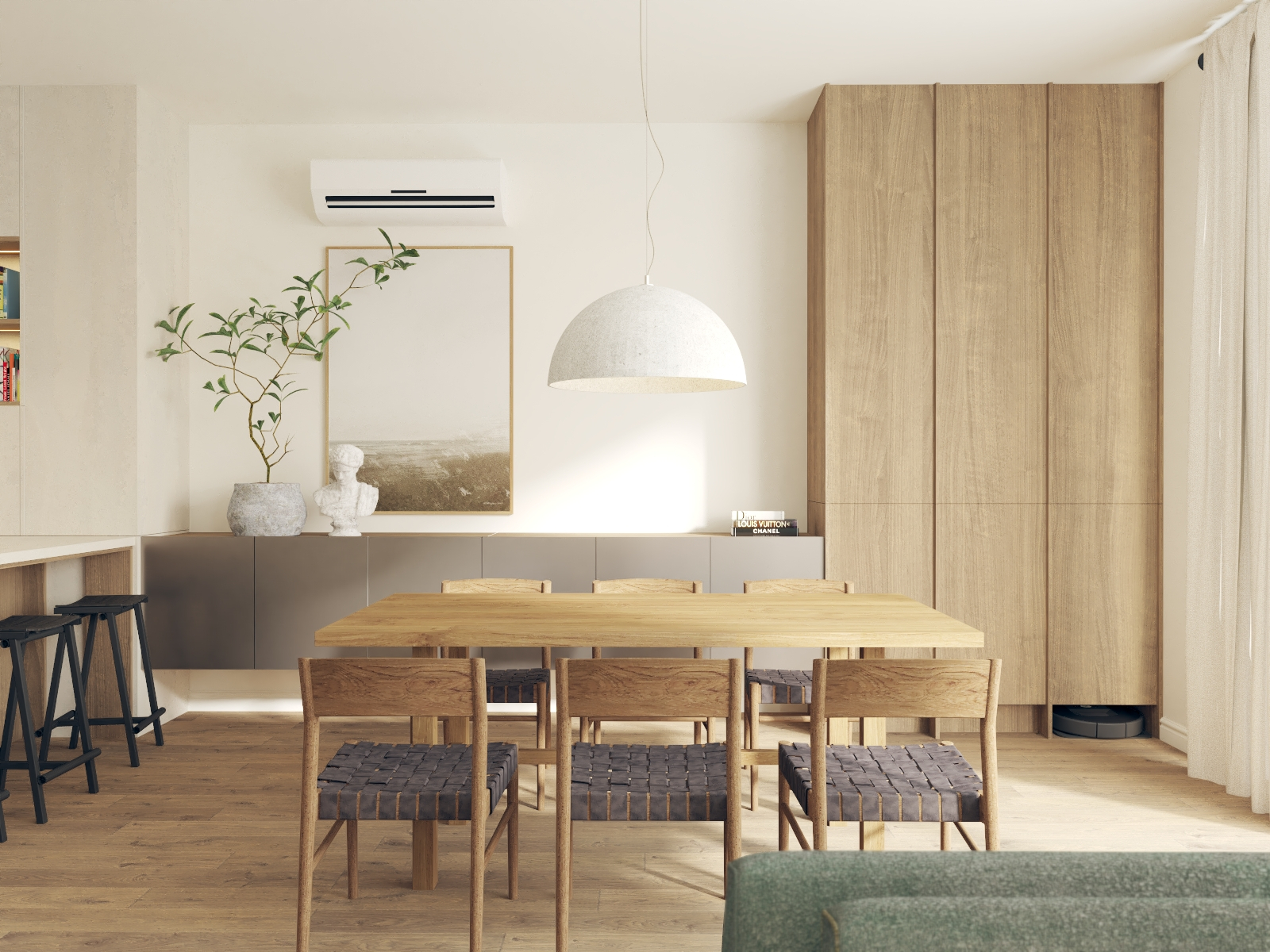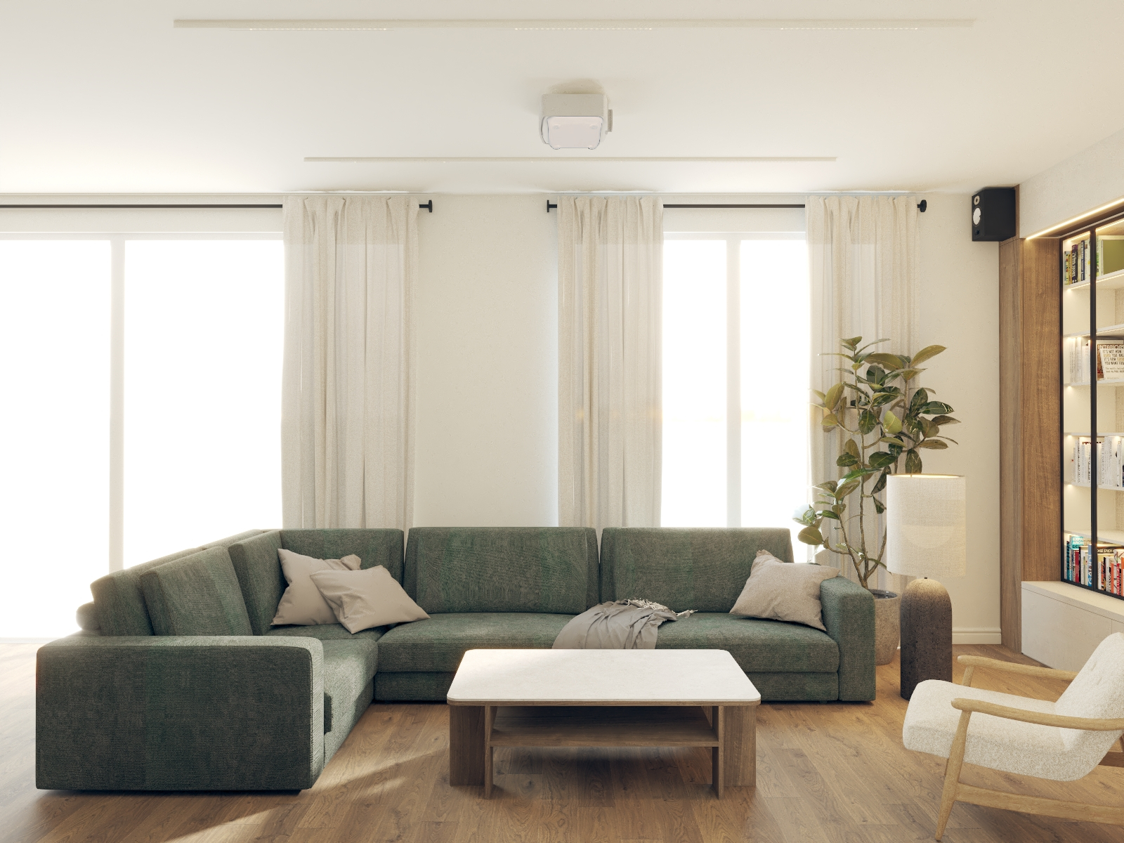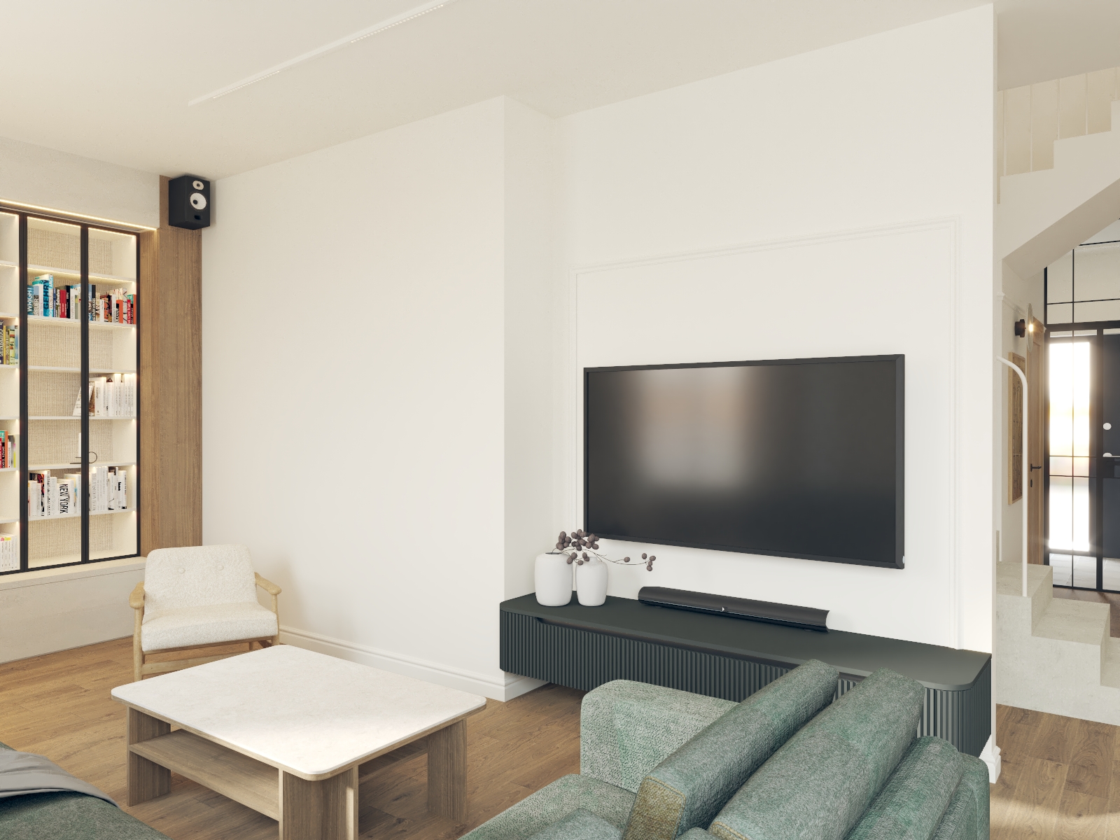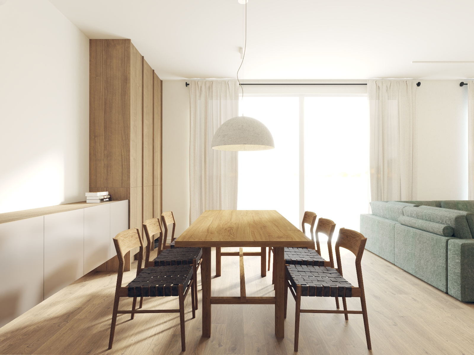 Od tego właśnie zaczął się ten projekt - w propozycji dewelopera bezpośrednio z półwyspem sąsiadowało miejsce na kanapę, a dopiero dalej, w drugim końcu litery "L" było miejsce na stół. Wyzwanie polegało na tym, że to "L" w miejscu stołu było dość małe i wąskie w porównaniu do reszty, a umówmy się, strefa wypoczynkowa jest strefą bardzo istotną. Postawiłam sobie za punkt honoru, aby jednak jakoś to odwrócić. Udało się to dzięki wysunięciu narożnika nieco bliżej środka całego pomieszczenia :) w "wąskim gardle" przewidzieliśmy biblioteczkę (i tak była planowana), a telewizor znalazł swoje miejsce dzięki dodatkowej ściance, za którą chowa się wygospodarowane przy okazji pomieszczenie gospodarcze. A potem, gdy mieliśmy już prawie całą estetykę dograną zapadła decyzja, aby nieco "ochłodzić" całą tonację. I w ten właśnie sposób, dzięki aktywnej postawie moich Klientów podczas spotkania materiałowego znaleźliśmy ten super-ciekawy, aloesowo-szałwiowy odcień zieleni. Realizacja trwa, ale ja już wiem, że to będzie rewelacyjne miejsce do życia!