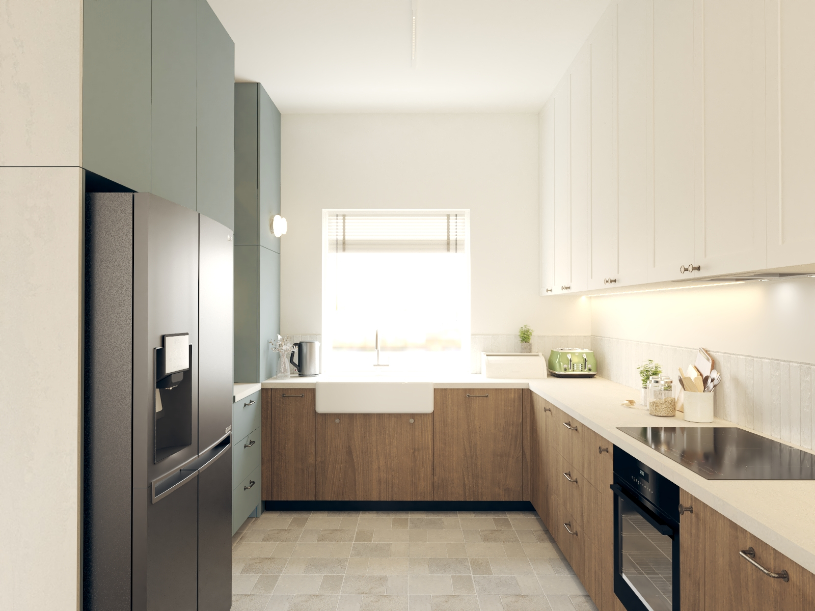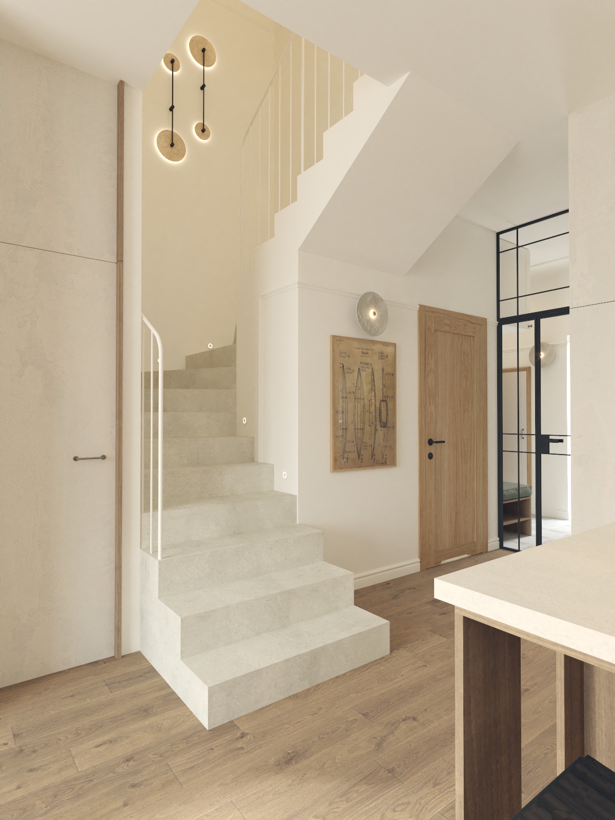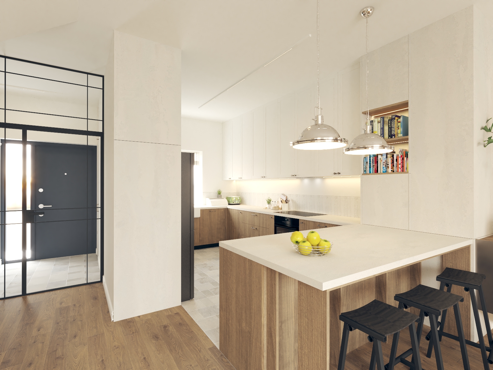 Od tego właśnie zaczął się ten projekt - w propozycji dewelopera bezpośrednio z półwyspem sąsiadowało miejsce na kanapę, a dopiero dalej, w drugim końcu litery "L" było miejsce na stół. Wyzwanie polegało na tym, że to "L" w miejscu stołu było dość małe i wąskie w porównaniu do reszty, a umówmy się, strefa wypoczynkowa jest strefą bardzo istotną. Postawiłam sobie za punkt honoru, aby jednak jakoś to odwrócić. Udało się to dzięki wysunięciu narożnika nieco bliżej środka całego pomieszczenia :) w "wąskim gardle" przewidzieliśmy biblioteczkę (i tak była planowana), a telewizor znalazł swoje miejsce dzięki dodatkowej ściance, za którą chowa się wygospodarowane przy okazji pomieszczenie gospodarcze. A potem, gdy mieliśmy już prawie całą estetykę dograną zapadła decyzja, aby nieco "ochłodzić" całą tonację. I w ten właśnie sposób, dzięki aktywnej postawie moich Klientów podczas spotkania materiałowego znaleźliśmy ten super-ciekawy, aloesowo-szałwiowy odcień zieleni. Realizacja trwa, ale ja już wiem, że to będzie rewelacyjne miejsce do życia!