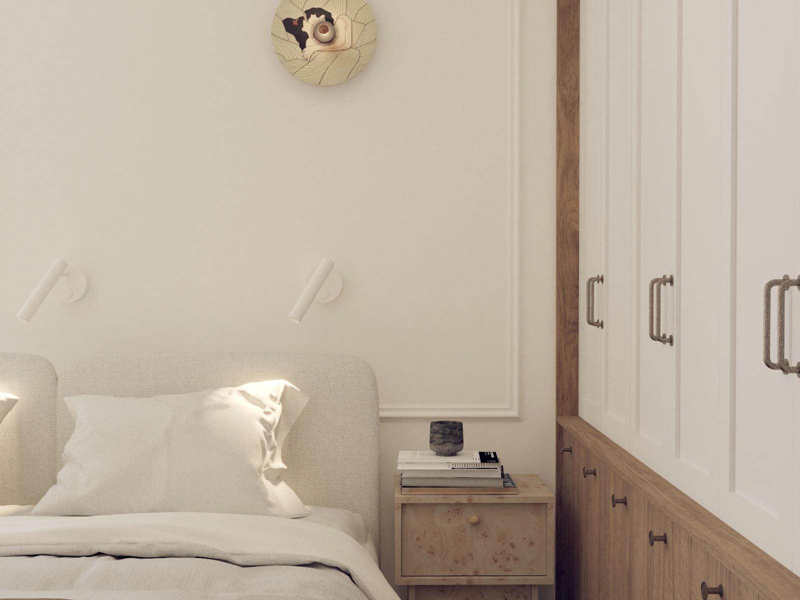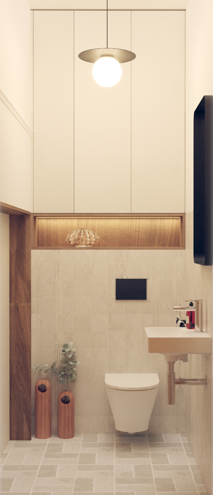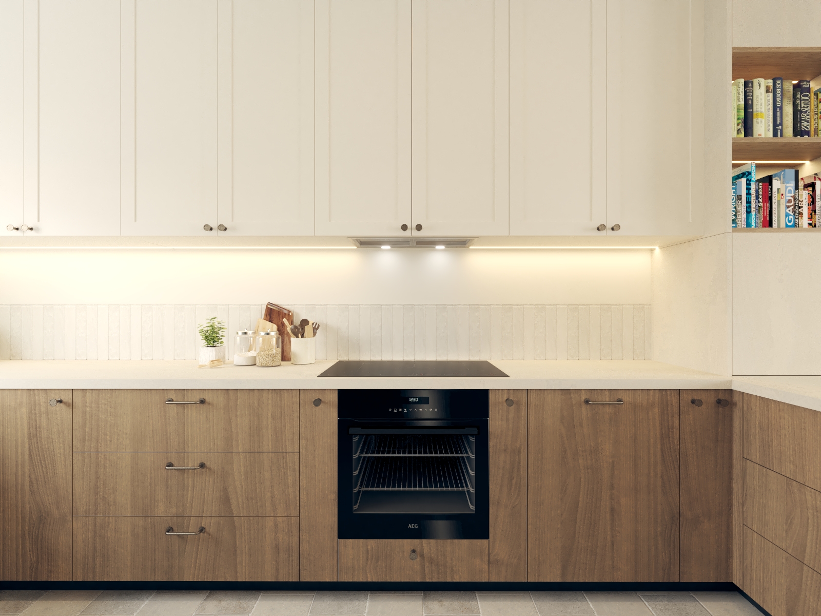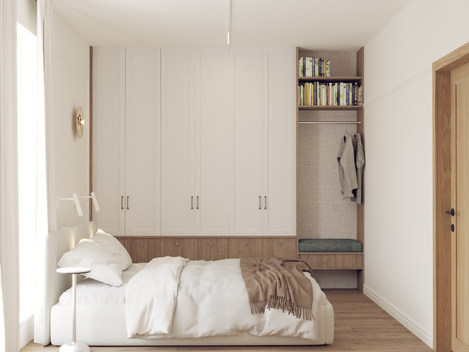 Od tego właśnie zaczął się ten projekt - w propozycji dewelopera bezpośrednio z półwyspem sąsiadowało miejsce na kanapę, a dopiero dalej, w drugim końcu litery "L" było miejsce na stół. Wyzwanie polegało na tym, że to "L" w miejscu stołu było dość małe i wąskie w porównaniu do reszty, a umówmy się, strefa wypoczynkowa jest strefą bardzo istotną. Postawiłam sobie za punkt honoru, aby jednak jakoś to odwrócić. Udało się to dzięki wysunięciu narożnika nieco bliżej środka całego pomieszczenia :) w "wąskim gardle" przewidzieliśmy biblioteczkę (i tak była planowana), a telewizor znalazł swoje miejsce dzięki dodatkowej ściance, za którą chowa się wygospodarowane przy okazji pomieszczenie gospodarcze. A potem, gdy mieliśmy już prawie całą estetykę dograną zapadła decyzja, aby nieco "ochłodzić" całą tonację. I w ten właśnie sposób, dzięki aktywnej postawie moich Klientów podczas spotkania materiałowego znaleźliśmy ten super-ciekawy, aloesowo-szałwiowy odcień zieleni. Realizacja trwa, ale ja już wiem, że to będzie rewelacyjne miejsce do życia!